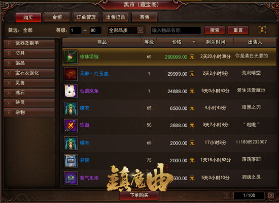 “仙兔”原画黑市是《镇魔曲》专为玩家交易各种物品而在游戏内设置的交易系统,跟第三方交易平台相比安全性得到了极大的提升,而且提现方便,官方仅收取10%的费用。在游戏中,打到一件用不着的好装备后,顺手挂到黑市出售已经成为了玩家的一个习惯。