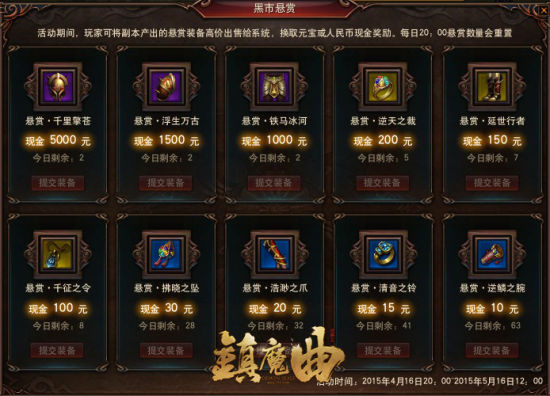 每个服务器共悬赏7500件装备鉴于此次黑市悬赏玩家的踊跃参与,《镇魔曲》官方意见表示,之后的每个新服都将举行单服、金额达到25万的黑市悬赏,以让所有玩家都能享受到福利,并重新找回打装备的乐趣。
