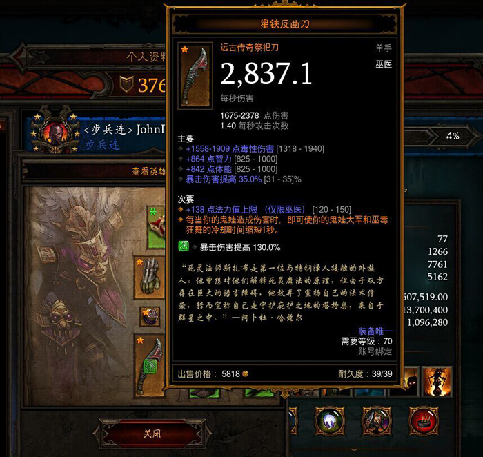 A:在使用猎魔人冲击大秘境53层时,意外的掉落了一个远古星铁反曲刀。于是我就练了一个巫医。
