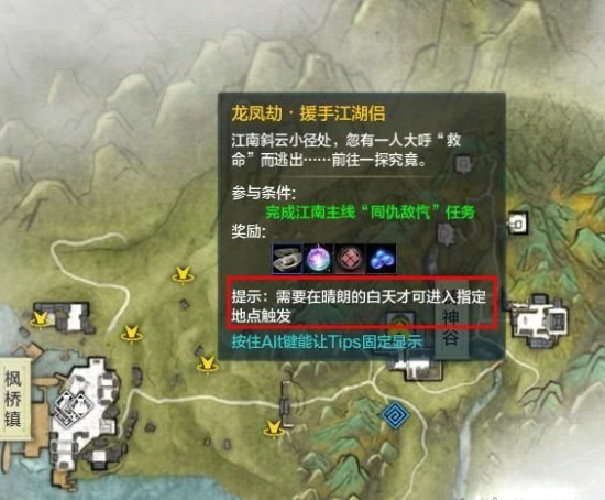5、还有其他的见闻是需要达成一定条件之后才可以触发,有的可能是与某一NPC对话,也有可能是需要完成某一任务之后才可以触发,甚至是需要 “天时地利人和”等条件才可以触发,由于每个见闻的触发条件不同,所以请大家一定要看清提示。要提醒大家一定要注意看提示,不仅有的见闻是白天才可以完 成,有的还是需要夜间才可以完成的。