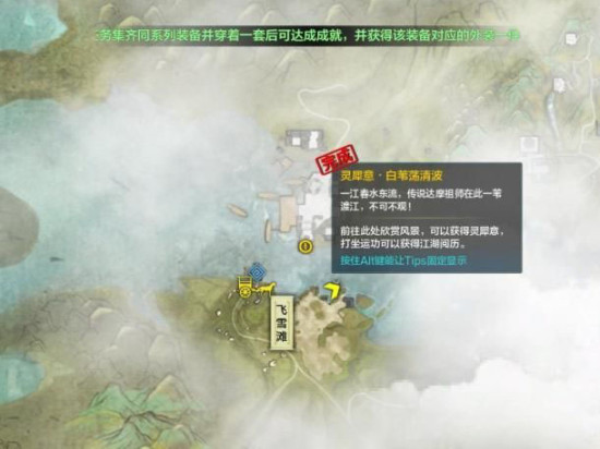 2、走过去就可以接取这个见闻任务。另外,可以先把鼠标指针放到黄色的三角上,可以看到这个见闻任务的详细内容。在诸多的见闻任务中,最简单的 最容易做的应该就是如“灵犀意-白苇荡清波”,有“灵犀意”开头的见闻了。这类见闻很简单,只需要抵达这个地方(也就是黄色三角处)附近,打坐运功就可以 获得修为(修为也就是所谓的经验了);