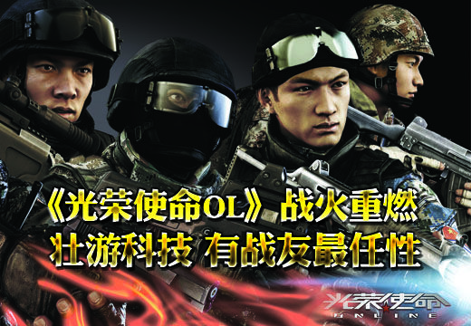 《光荣使命OL》战火重燃《光荣使命OL》是一款非常成功的FPS游戏,自2013年8月技术测试以来便深受国内众多军迷以及FPS死忠玩家的喜爱,成为中国军事游戏迷们的最爱。游戏中高度接近现实战争的游戏设定,高度逼真的枪模,优秀的枪械射击手感等等这些无不让众多FPS玩家乐在其中。并且在众多光荣使命玩家的大力支持下,游戏先后获得了“最受玩家期待的FPS类游戏”、“最受玩家喜欢的FPS类游戏”等国内外多项游戏产业奖项与提名,获得了骄人的成绩,这不仅是光荣使命网络科技有限公司所有工作人员为此而付出的努力,更是源自于广大战友的支持和鼓励。