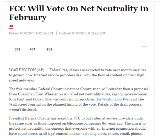 美国众议院将在2月份举行投票,关于是否限制ISP(互联网服务提供商)勒索公司及个人进行表决。这项投票由FCC全称美国联邦通讯委员会(Federal Communications Commission)发起,名为Net Neutrality(网络平等),目的在于消除大公司与小公司以及个人之间的不平等待遇,以前ISP会将优质资源供给大型公司诸如亚马逊,Netflix等,但现在FCC想要给全民提供一个平等中立的互联网服务。