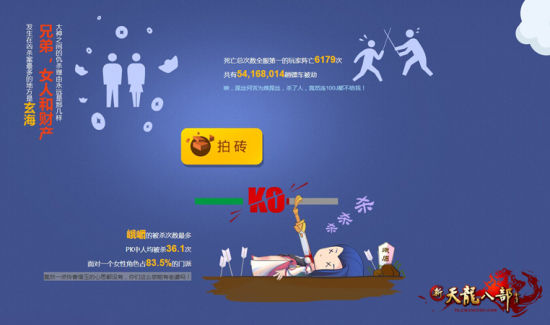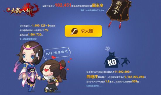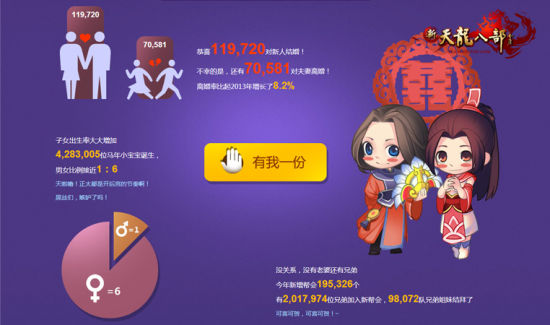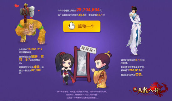 导语:时间过的真快,转眼间,3D浪漫武侠网游《新天龙八部》新春“缘聚天下”版1月29日即将上线了,难忘的2014年已经成为过去,有太多的过往需要回忆……你或许任劳任怨的刷了一年活跃帮贡,也可能无怨无悔的当了一年备胎……自己的糗事虽然不想再提,但是看看其他玩家做了哪些蠢事,还是很爽的嘛!来,让我们坐下,一起欣赏亿万玩家共同创造的2014年数据趣闻吧!