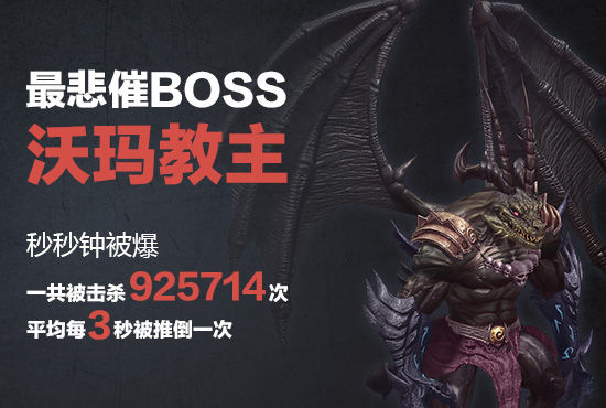 作为ARPG游戏的重头戏,推BOSS是每位玩家最喜爱的日常玩法之一了,寂寞了许久的BOSS们,也正满目娇羞地等待着被玩家推倒呢~37《传奇霸业》中BOSS辣么多,最身娇体弱易推倒的沃玛教主荣幸当选为“最悲催BOSS”,平均每3秒就要被推倒一次,承受来自玩家们爱的蹂躏。