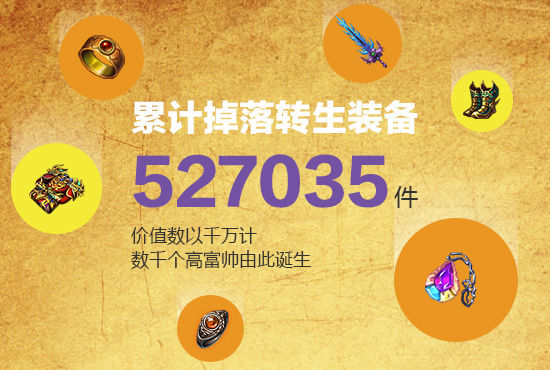转生系统是37《传奇霸业》中一个非常重要的玩法系统,通过转生,玩家可以获得更为逆天的属性,面临更加严峻的挑战。截止到目前为止,游戏中共掉落转生装备527035件,这价值以千万级的珍品装备掉落,意味着数千个高富帅,在传奇世界里完成了他们的华丽变身!