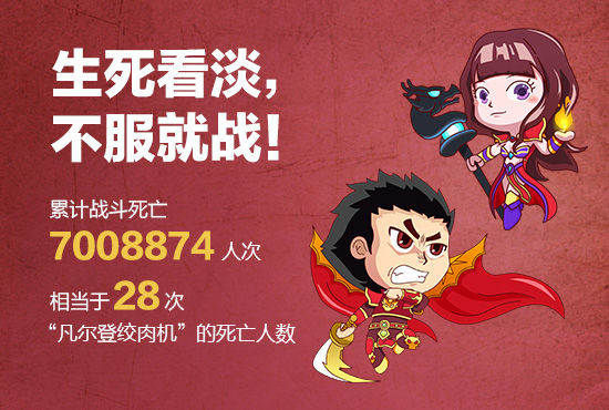 除了打BOSS和攻城战之外,37《传奇霸业》中每天每时每分每秒都在发生着战斗、流血、伤亡事件。游戏公测35天,累计战斗死亡7008874人次,相当于28次“凡尔登绞肉机”的死亡人数。在这片传奇大陆上,只能将生死看淡,卯足了劲往前冲,才能有机会成就自己的霸业。