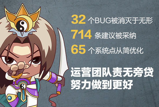 为了让玩家玩得更为尽兴,37《传奇霸业》运营团队也是尽心尽力地从满足玩家需求的角度出发,35个日夜不眠不休地为玩家提供最贴心的服务。这期间运营团队的小伙伴们共接纳玩家意见714条,游戏中32个BUG被消灭于无形,65个玩法系统点从简优化,让游戏环境更为稳定,游戏玩法更加精彩!