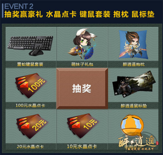 活动期间,登录账号即可获得一次抽奖机会。多重好礼送不停,就是这么任性!为自己喜爱的职业投票或者转发至微博还可增加抽奖机会!萌妹子礼包、水晶点卡,你是否心动?《醉逍遥》抱枕、雷蛇键鼠套装、《醉逍遥》定制鼠标垫,你是否眼馋?快来参加吧,奖品多多,机会多多,等你带回家!