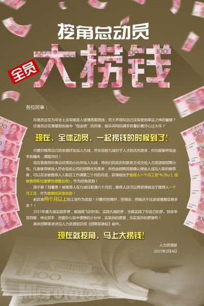 2015年2月5日,就在九城年会“撒钱门”闹得沸沸扬扬之后的几天,有消息透露,九城人力资源部发出内部邮件,鼓励员工向外挖角,积极招揽优秀人才,挖角奖励高达“推荐人薪水*N+1”——起码双薪奖励,并将此一计划命名为“全员大捞钱”。