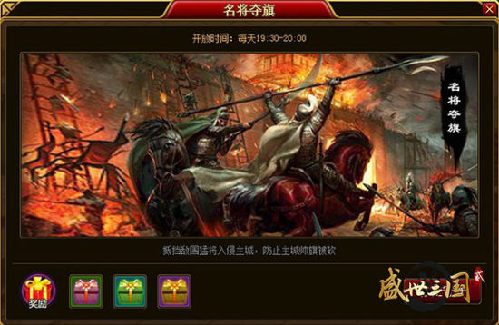 每天的19:30开启名将夺旗任务。活动开始时,将会在各国主城的三个城门口出现大批士兵,以及数个名将来攻城夺旗,玩家的任务则是尽可能保护旗子的完全不被破坏。