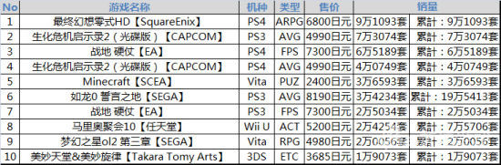 另一方面,《生化危机启示录2》的PS3版取得7.3万套销量,PS4版排在榜单第4的位置。加上XboxOne版,三版本首周总共卖出11.5万套。非常接近2013年5月发售的家用机版《生化危机启示录HD》的销量成绩,可以说是个不错的开局。