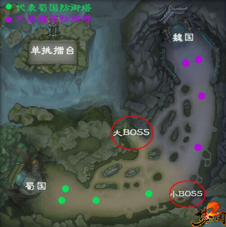 7V7华容生死战单挑擂台华容生死战的胜利方式只有1种,基地在人在,基地亡人亡!由于人头数无法结束游戏,也使该地图更具有策略性,并且,推塔也就成为本张地图的关键所在。因此,地图中的两个BOSS点就成为大家争夺的焦点之一。地图中共有一大一小两个BOSS点,击杀小BOSS可以获得增益BUFF,助你一臂之力。而击杀大BOSS炎魔,则可以获得炎魔之力为己用,短时间内化身炎魔参与战斗,用来自地狱的烈焰肆虐战场,帮助队伍进行推进!绝对是推塔利器!