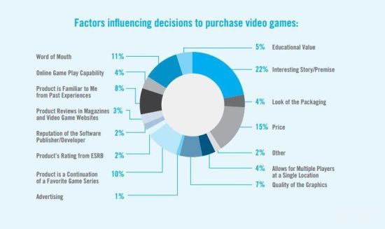 ESA通过在全美地区超过4000份的调查报告总结出,“精彩的故事/背景”是大多数主机玩家选择游戏的主要原因,占了22%。虽然近年来游戏分辨率和帧数已经成为了讨论最多的话题,但这并非是人们选择游戏的主要标准,因为这类消费者只占了全部人数的7%。在它之前,玩家更关心口碑(11%)、游戏习惯(8%)、偏好续作(10%)和价格(15%),画面在影响玩家购买游戏的因素中只排到了第6位。