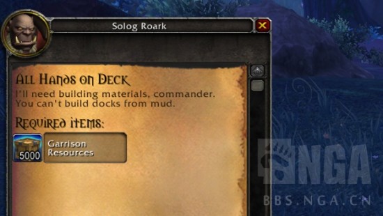 当你进入6.2 PTR的要塞中,你会立即获得任务通知,根据阵营的不同分别与沃金、瓦里安国王对话,他们将帮助你对塔纳安丛林展开进攻。随后你便被派去前往钢铁码头。完成一系列任务后,你会接到船坞的建造任务,需要5000要塞资源。