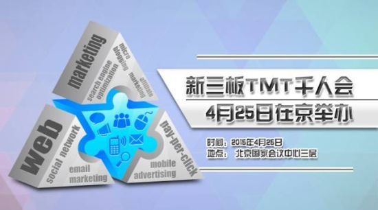 2015年4月25日,由世界O2O组织、全球移动游戏联盟、光合资本、《创业家》、激荡新三板创业者俱乐部等多家组织机构联合主办的“新三板TMT千人大会---新常态 新机遇 新挑战 新创客”,将在北京国家会议中心举行。此次会议由北京市海淀区金融办、北京市东城区金融办、北教传媒、哇棒传媒、星光传媒等单位协办,云集了中央外宣办《中国报道》、中国证券报、第一财经、CCTV央视证券频道、《投资与理财》杂志等协办媒体和周五咖啡、金英会、坚持企业家俱乐部、CCTV证券资讯频道投资联合会、微信自媒体“新三板”、速途网、微媒体、创投大咖等支持媒体,为大家深度解读新三板对企业发展所带来的机遇与挑战。