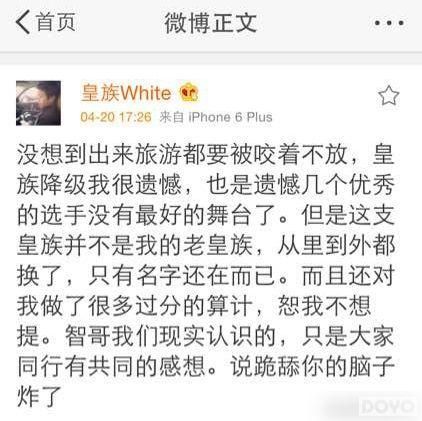 另外,当天早些时候,White似乎还曾发表过一条微博,认为现在的皇族已经并非自己当初呆过的老皇族,这条微博也在之后被删除。