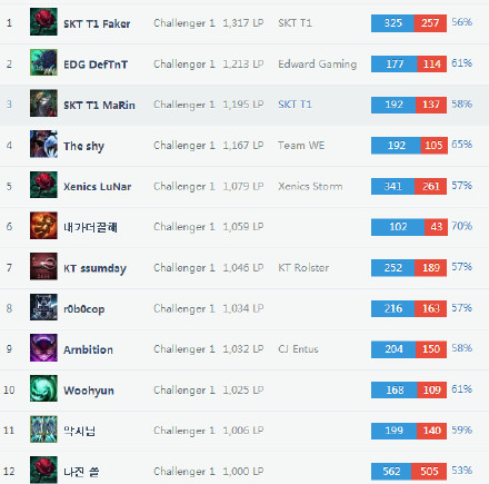 第三名是SKT T1 上单选手Marin ,韩国Rnak分1195的胜点。