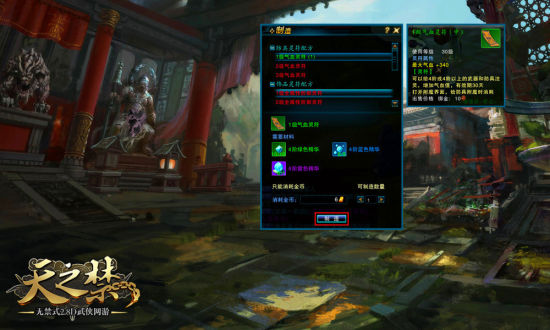 在各大MMORPG游戏中,广大玩家都会有一个困扰:同一类型的装备,一个是几条属性都很好但是数值不高,另一个是单条属性的数值特别高,但其余属性不是你想要的,所以大家都会在这种抉择中迷茫。不过在《天之禁》的游戏中,玩家再也不用担心这种窘境的发生了。独创融魂系统,可将数值较高的属性合到数值较低的装备中,让你每个装备都能同时拥有多条极品属性。初次之外,还可以通过分解无用的装备,获取材料,来制作气血灵符,来打造装备,增强装备属性。