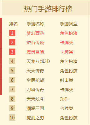 在本周的热门游戏排行榜上,与上周相比,前四名的手游排名没有任何变动,《天天传奇》升至第五位,这也是近两周新游第一次挤进前五的位置。新游《魔剑之刃》、《潮爆三国》本周排名已跌至末位。