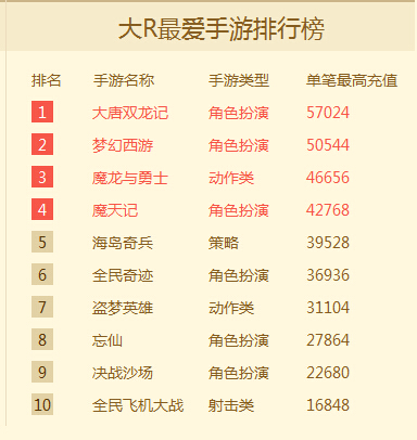大R最爱排行榜上,新游扎堆爆发《大唐双龙传》、《魔天记》、《魔龙与勇士》、《盗梦英雄》包揽了前排的4个位置,近期上榜新游类型主要集中在角色扮演类和动作类,这也是大R们比较喜欢的游戏类型。