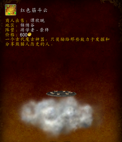 这貌似是唯一一个在天上飞不会抖动的坐骑,用起来十分流畅,踩在云上上下飘飞的感觉很棒!可能暴雪不太了解真正孙悟空的筋斗云,在上面加了1块板防止玩家从云上掉下。整个MOP只有一种【红色】筋斗云,以后不太可能染色增加。