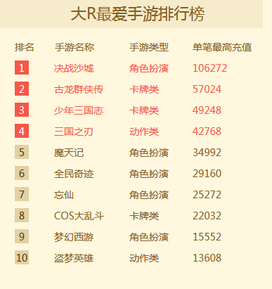 大R最爱排行榜上,本周最抢眼的游戏非《决战沙城》莫属了,作为“传奇”类游戏狂热粉还是有的,单笔充值超10W也刷新了大R最爱排行榜的记录,也给热门游戏敲了一记警钟,光有热度是不够的,忠实的粉丝才是游戏生命周期的保障。
