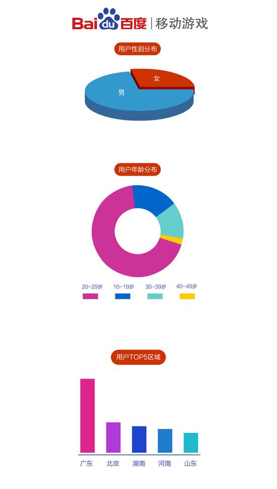 报告还展示了4月份平台用户的一些特征,数据显示,平台用户男女比例基本为7:3,女性用户潜力巨大,且已经展示出强大的活力,4月份新上线的《范冰冰:模范学院》成功跻身留存TOP10榜和玩家关注TOP10榜,与女性玩家不无关系。用户年龄方面,20岁-29岁仍为玩家主力人群。用户地域方面,广东、北京、湖南、河南、山东位居用户数量前五位。
