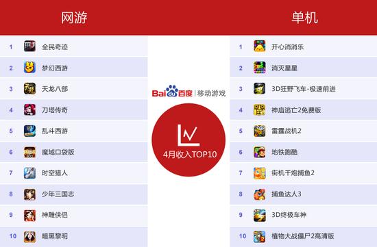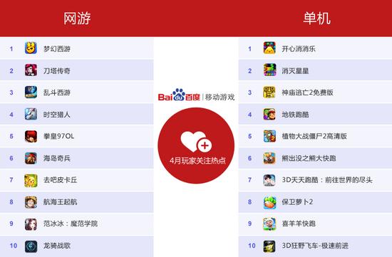 报告显示,4月份百度移动游戏平台RPG、卡牌、休闲类手游依然占据着各项数据榜单的主要位置。《全民奇迹》、《梦幻西游》、《刀塔传奇》、《乱斗西游》、《时空猎人》、《海岛奇兵》等多款明星产品均表现出了极强的战斗力,备受玩家青睐。可见尽管目前市场上手游数量剧增,玩家热点切换较为频繁,然而,只要游戏具备优质内容并能在后期做好持续的优化改进、强势平台精细化运营的加持,就能保持游戏对玩家的持续吸引,从而保障收入的持续飘红。