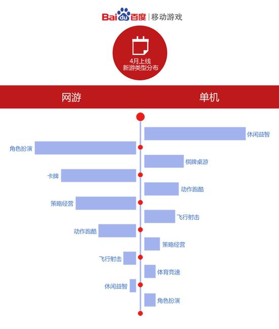 4月份,百度移动游戏新上线游戏产品144款,其中网游90款,单机54款。从上线游戏产品类型的构成来看,本月上线新游类型更加多样化,但网游上线新游中RPG类和卡牌类上线新游仍占据近7成;单机上线新游中则是以上手简单且操作门槛低的休闲益智类游戏为主,占据单机上线新游的近5成之多。