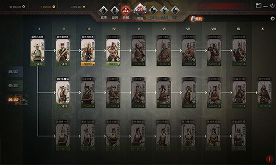 此次开测,《虎豹骑》将开放魏、吴两国科技,各包含两条兵种升级线。玩家通过不断战斗累计经验、声望和铜钱,为所辖兵种解锁并购买所需武器、装备和马匹,进而发展成更高级的兵种。只有真刀真枪的拼杀,才能逐一解锁高阶兵种,装备上并不会出现像其他游戏那样强化或是宝石加成等环节。
