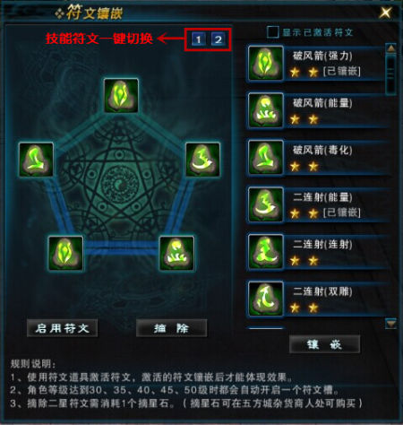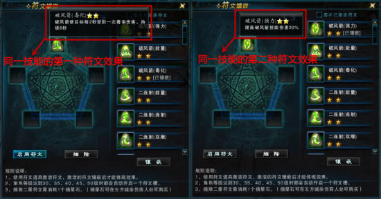 镶嵌了不同特效的符文后,一个基础技能便会被分为三个或更多不同种技能【 随时更换 出其不意 】