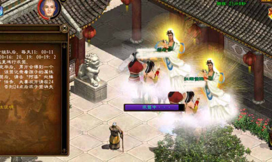 结婚之后,这时夫妻双方也可以顺理成章的生一个属于两人的爱情结晶,共同组建一个幸福的三口之家。想要孩子第一步首先需要去夫妻两组队王城的方丈处求签,求签完毕后,男方会得到一个祝福过的签,签记录着孩子的属性。求签出来的属性每次不同,单一属性的签会更好。获得求子签后,再去阿婆处接洞房花烛任务。并且夫妻双方在24点前去洞房,否则24点后求子签将消失。如果对求的签不满意可以第二天再去。