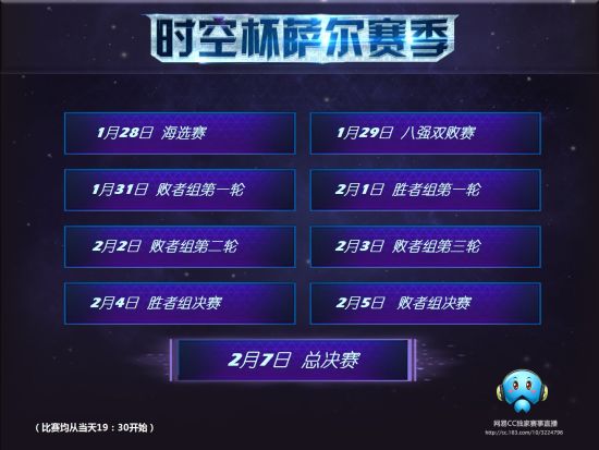 根据赛事日程,海选赛将于1月28日举行;次日将开启八强双败赛,上演为期一周的胜者组及败者组的激烈对抗。季军赛于2月5日举行, 最受瞩目的总决赛将于2月7日为大家奉上,胜方将问鼎第二届时空杯の萨尔赛季冠军。广邀各位英雄加入,对抗强者,一同来战!