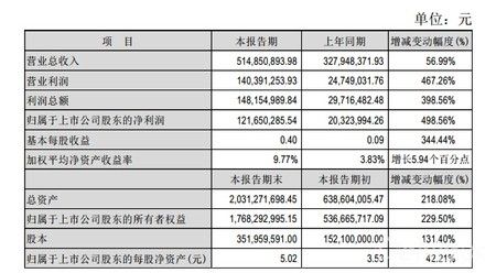 公告显示,报告期内天舟文化实现营业收入514,850,893.98元,较上年同期增长56.99%;实现营业利润 140,391,253.93元,较上年同期增长467.26%;实现利润总额148,154,989.84元,较上年同期增长398.56%;实现归属于上市公司股东的净利润121,650,285.54元,较上年同期增长498.56%。