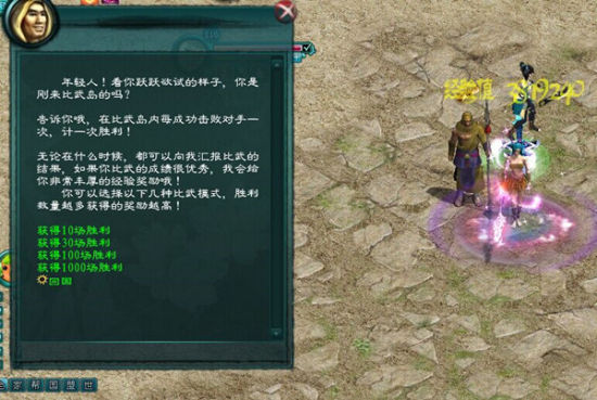 除了在比武岛内获得海量的经验之外,比武岛还有个重要的功能就是切磋比武。进入比武岛后,每个人都是蒙面人状态。你不能观察到对方的装备,对方也无法观察到你的状态,而且也不知道对方的名字,这样PK起来也更能无所顾虑,而在PK时,也更考验自己的操作手法,如果看不到装备,无法预知对方的情况,这时就需要灵活运用到一键换装等。为了能让自己在PK时获得更多的奖励。你可以去岛附近的本国使者处领取任务,选择不同的比武模式,胜利数量越多时,获得的奖励也越高。