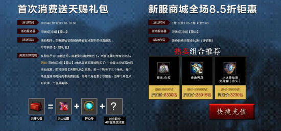 开服当日在新服钻石商城消费钻石点数购买任意道具,即可获得包含天山仙露、护心丹和相应职业4阶金色主法宝的【天赐礼包】,活动仅限开服当天到18:00哦,机不可失。开服第二天,在商城购买相应金额道具将会有长效开化丹赠送,并且可获得八安钛晶以及仙界加血药水等非出售类珍稀道具奖励!不仅如此,开服当日至3月14日12点,商城内所有道具8.5折出售,此时便是和土豪做朋友的好机会。小编推荐组合:时装+白眉手谕(青龙印记包)黄金组,有机会掉落各种非售类道具或紫色全属性装备哦。