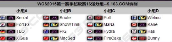 16强线下赛分组出炉WCS2015第一赛季的16强线下赛即将打响,让我们一起关注中国双星在WCS赛场上的精彩表现,也预祝中国星际能够闪耀WCS赛场,向世界证明来自中国的星际力量。