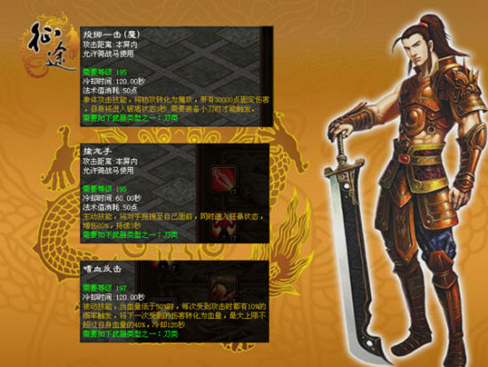 武圣的“投掷一击”可以将左手的小刀投掷出去,并带有30000点固定伤害。还有“擒龙手”可以将对手拖拽到自己面前,且进入狂暴状态,还增伤100%。这两个技能是武圣特有的,战士没有这样的技能。从这我们可以看出武圣保留了战士的精髓,并在战士的基础上增加了自己独有的,像战士左手的盾牌武圣可以依旧使用,盾牌也可以换成小刀,需要防御的时候就用盾牌在进攻的时候就可以换上小刀,真正的做到了进可攻退可守的需要。