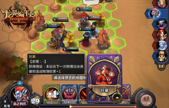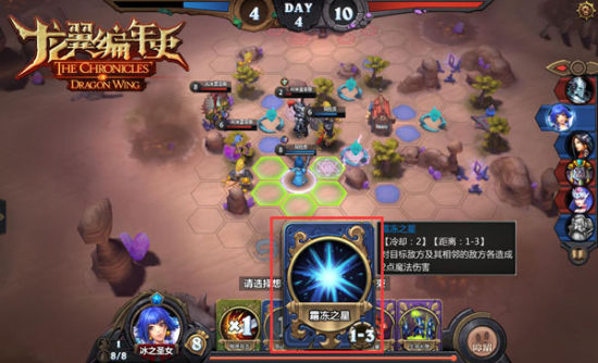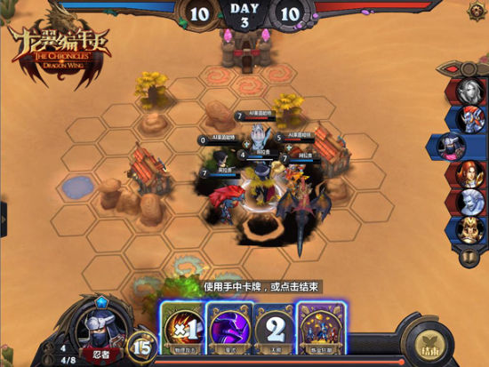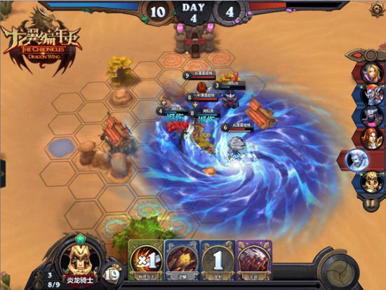 游戏截图除了之前提到的《龙翼编年史》容易让人联想到MOBA类型的游戏外,由于游戏中的卡牌元素又容易与时下的卡牌类游戏进行比较。同样都采用回合制的模式,时下卡牌游戏胜负很大程度上靠的是发到的卡牌随机性较大,而《龙翼编年史》注重的则是策略。游戏中每一回合6名英雄按顺序进行行动,英雄的走位以及技能的冷却值触发时机是相当关键的,制定合理的作战策略才是取胜的关键。