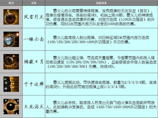 雷火儿生平绝学 雷火儿身着火红劲装,黑发中搀着一缕火红头发,虽为人滑稽搞怪,但武功绝不拖泥带水,江湖人称“小雷神”,破坏力不容小觑。雷火儿天赋风雷引天,生平绝学一锤必击、烟蔽日月、千手运弹、火龙滔天。