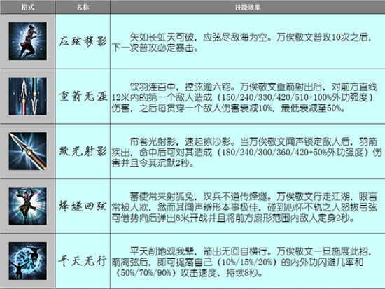 万俟敬文成名绝技 万俟敬文桀骜冷峻,自幼眼盲而练就迅捷身手,弓篓满箭,例不虚发,与人交手,通常速战速决,下手残忍。万俟敬文天赋应弦移影,成名绝技重箭无涯、默光射影、烽燧回弦、平天无行。