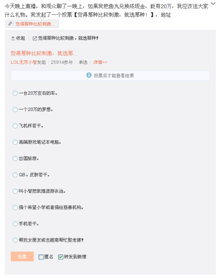 近来小智可谓是猛料频出,先是在微博上抨击某直播平台,在视频的知识产权上针锋相对,宣称要和其打官司。而后又在微博上自爆自己压力很大,已经濒临崩溃的边缘。作为一名公众人物,小智最神奇的地方是至今无人知道他的真实长相,虽然网上有很多关于他真人照片的曝光,但都没有得到他本人的正面承认,很多人称其为葫芦岛吴奇隆,猜测其长相应该比较帅。相比于这些花边新闻,今天凌晨小智的一条微博引起了爆炸性的关注,小智声称在近期的直播中会将鱼丸兑换成现金,总数大概约合人民币20万,并且会随即抽取一名幸运观众,将这20万完全交给这名粉丝处理,小智还在自己的微博中进行投票,让粉丝决定这20万巨款的具体用处。