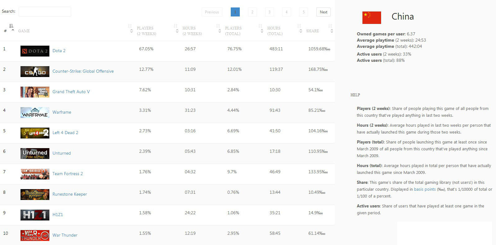 该数据统计来自于知名网站SteamSpy,在排行中详细的列出了中国玩家们的游戏持有度。该网站给出的数据分别是2周内玩家持有率(PLAYERS 2 WEEKS)以及2周内的平均游戏时长(HOURS 2 WEEKS),玩家总持有(PLAYERS TOTAL)和总平均在线时长(HOUS TOTAL),最后则是分享率(SHARE)。