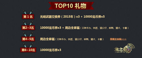 本次屠龙活动中,邀请老战友回归,并且与老战友并肩作战去屠龙就能获得相应积分,积分达到一定要求即可换取龙币商品券,而积分排名的前十名更有额外豪礼。本次活动前十名的勇士将获得光明武器交换券、海量龙币、周边全家福等珍贵奖励。活动结束之后,奖励将下发到玩家角色中。在这里也恭喜所有上榜的勇士,在领取奖励的同时也要记得和朋友一起分享荣耀哦!