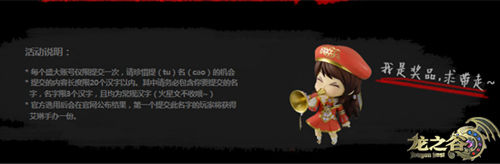 不管你是可爱的女孩子还是帅气的男孩子,都可以参加本次的雄性谷迷征名活动。一旦创意被采用,你将成为龙之谷历史的一个重要创造者哦。谷迷玩家可以登录活动页面,提交你心中最棒的雄性谷迷称号,每个盛大账号仅限提交一次起名结果,小伙伴们一定要且提名且珍惜。官方之后会在官网公布结果,第一个提交选中名字的玩家将获得艾琳手办一份。