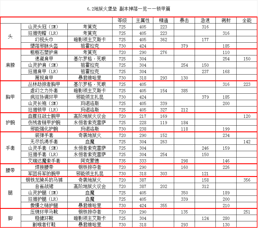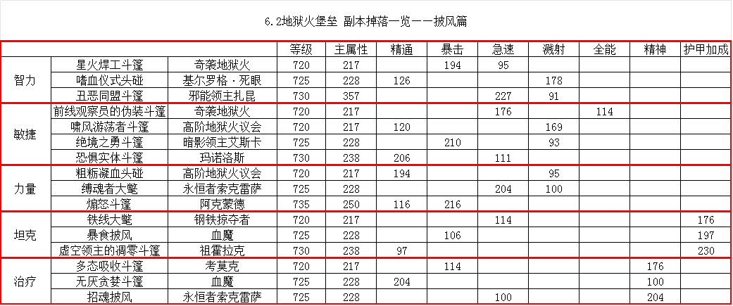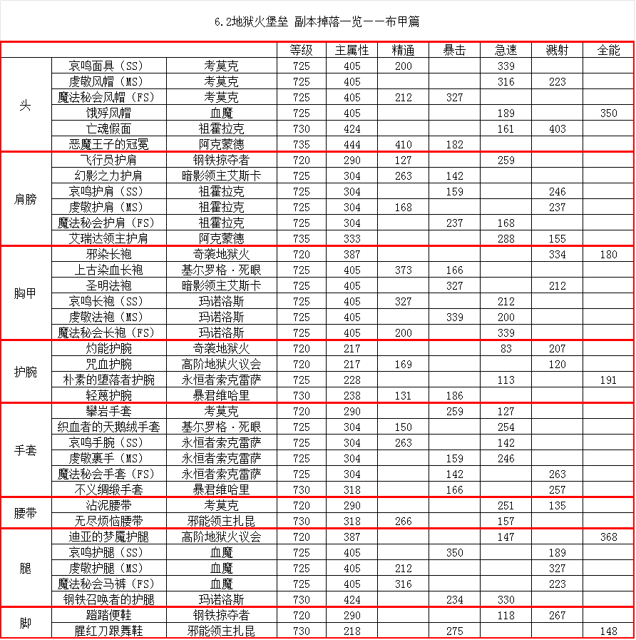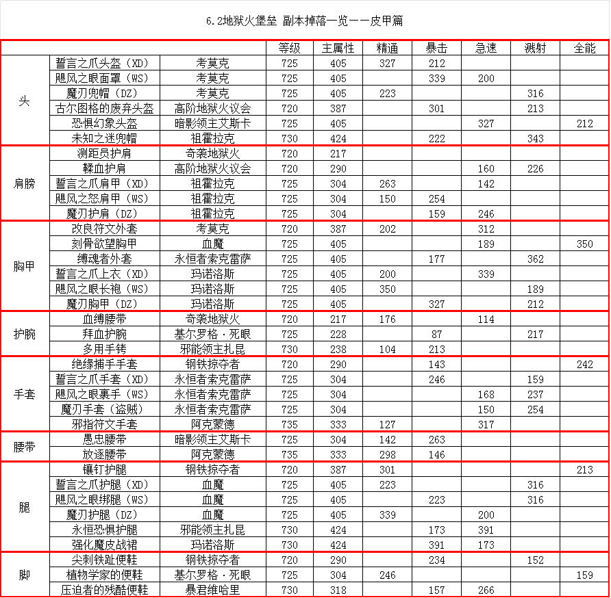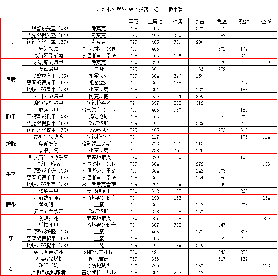 地狱火堡垒装备等级按照720-725-730-735递增,请读者看请列表中所示等级。