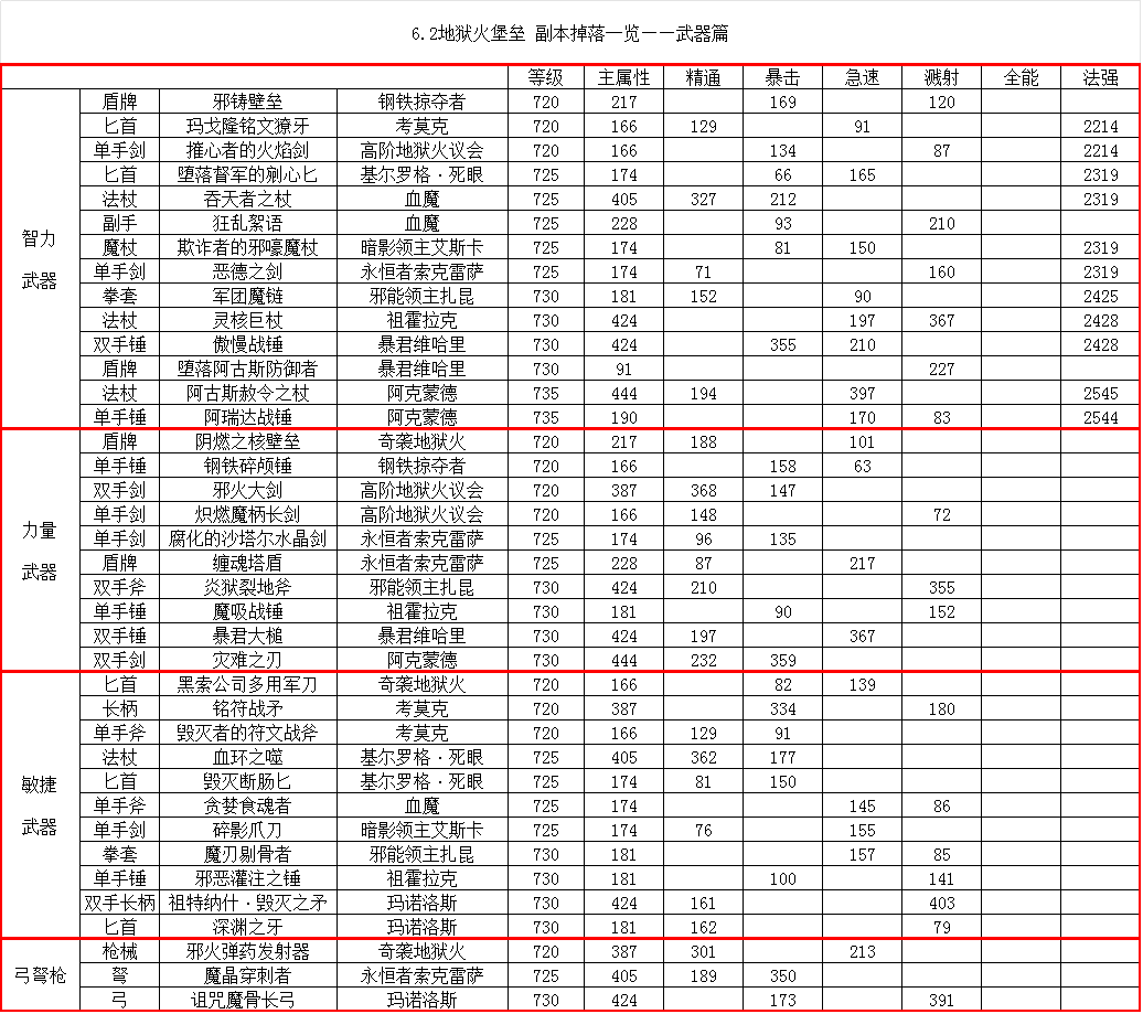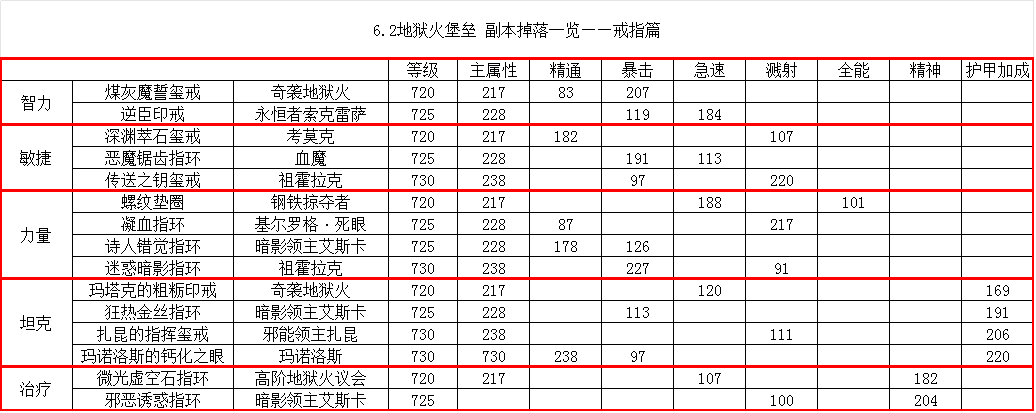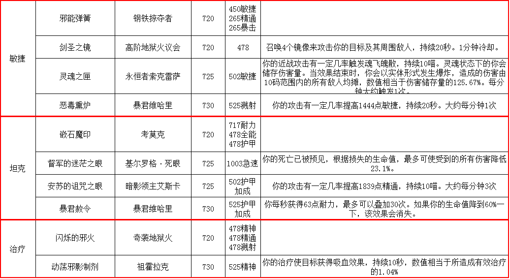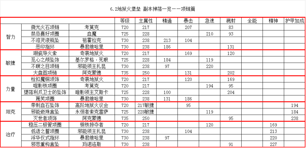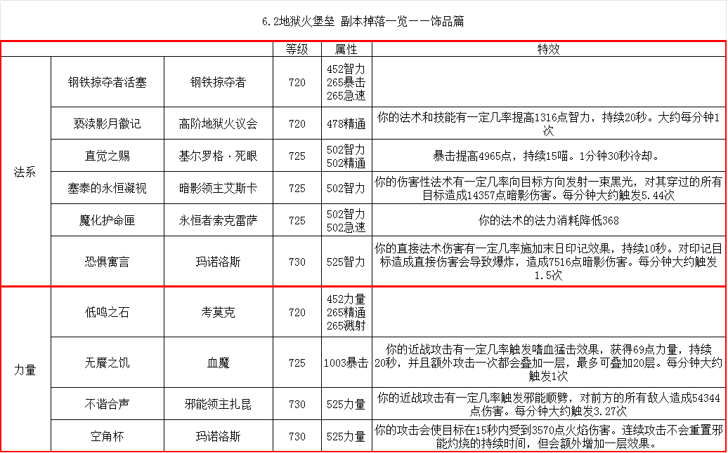 地狱火堡垒装备等级按照720-725-730-735递增,请读者看请列表中所示等级。