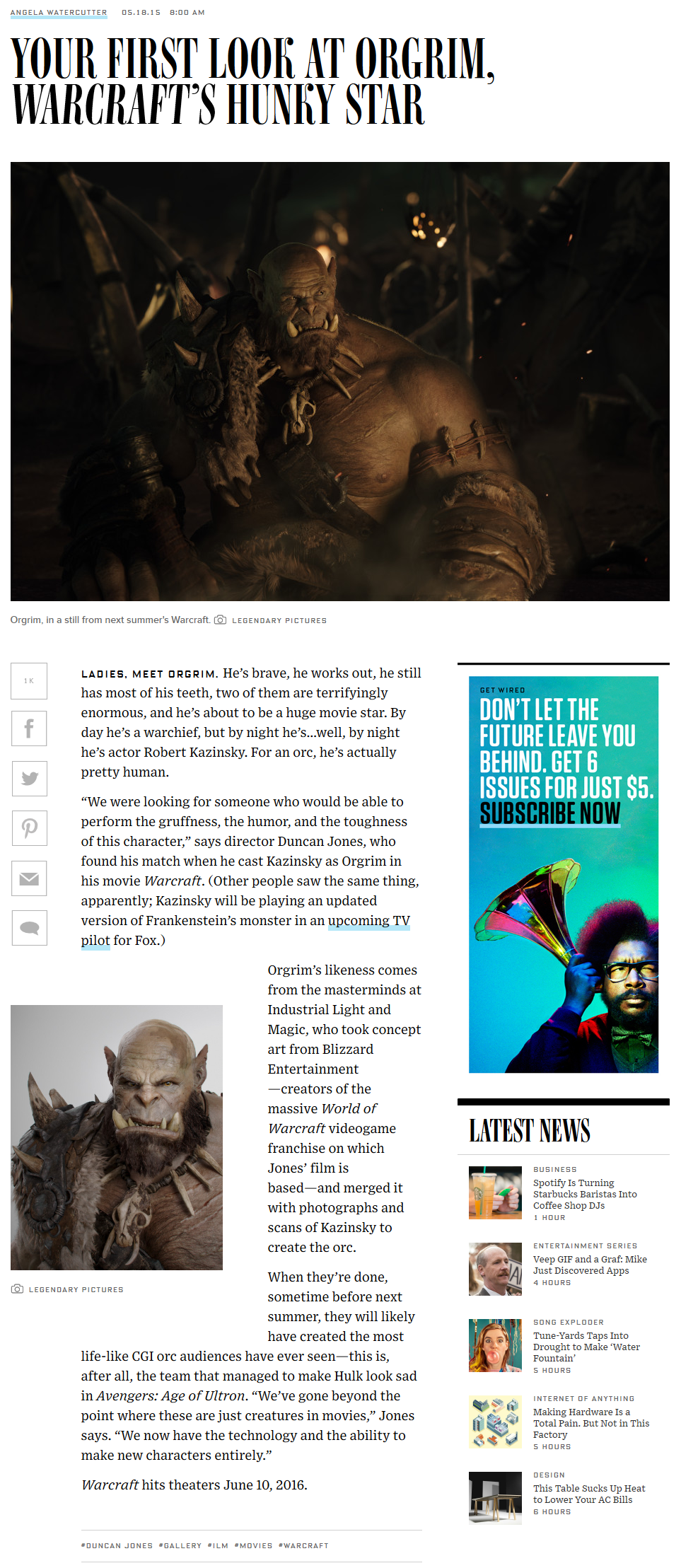 2015年5月19日夜间知名科技杂志《连线》杂志新鲜曝光《魔兽世界》电影角色,由Robert Kazinsky(罗伯特·卡辛斯基)扮演的奥格瑞姆也成了公开放出的第一个角色形象。