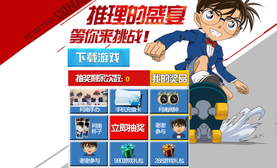除了代金券之外,360手机游戏还为柯南迷们准备了大量精美手办和礼包。玩家在5月20日至5月26日期间,每日登陆活动页面,即可获得一次抽奖机会,在360手机游戏下载游戏还可获得第二次抽奖机会。奖品包括柯南手办、柯南闹钟、手机充值卡等实物奖品,还有价值288元、980元的游戏大礼包。